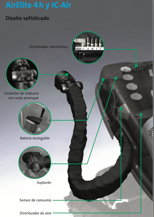 AirElite 4 h y IC-Air Diseño sofisticado Distribuidor electrónico Conector de máscara con auto-arranque Batería recargable Soplante Sensor de consumo Distribuidor de aire |
